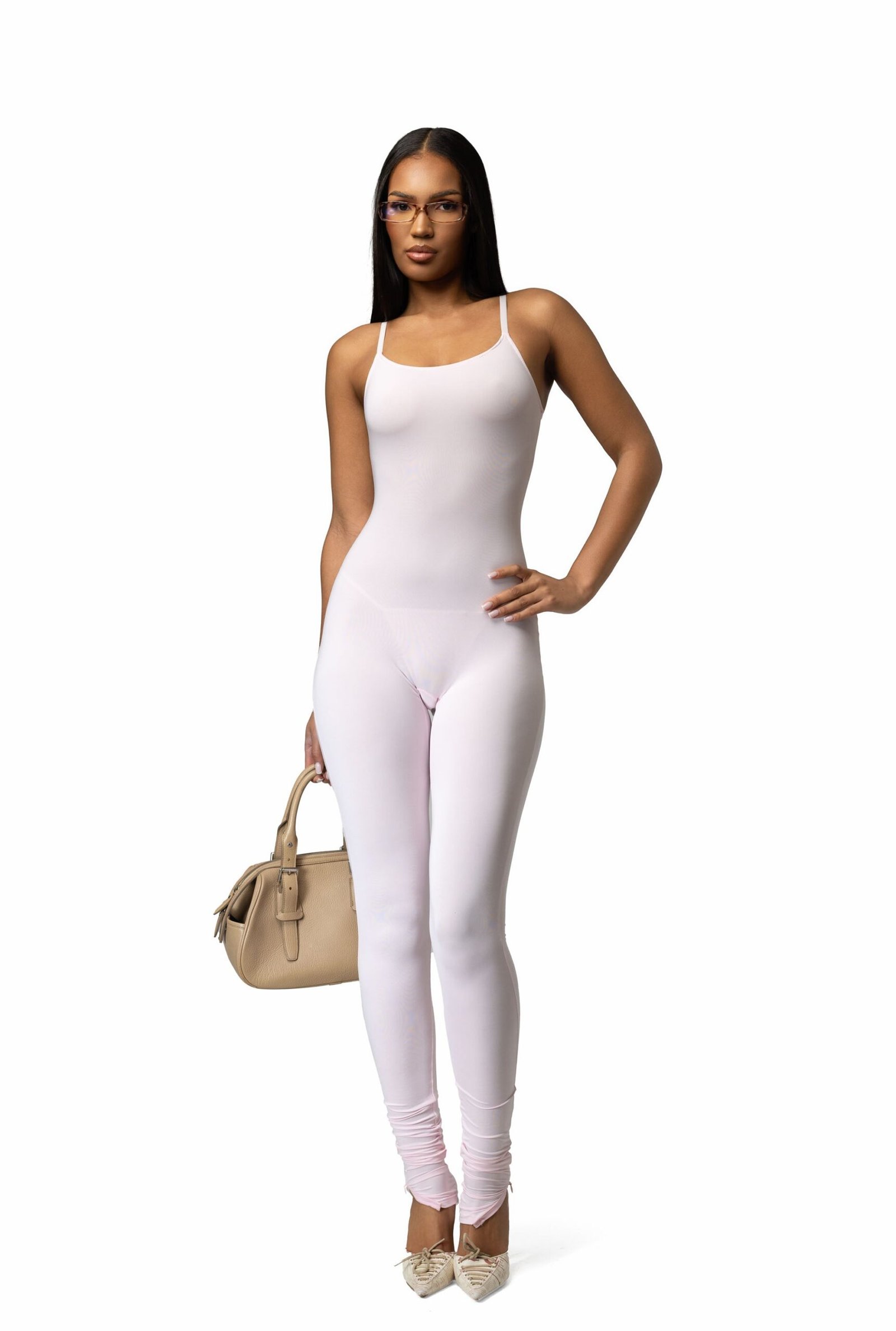 Baby pink strappy jumpsuit with zip hem feature.