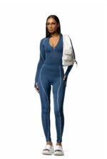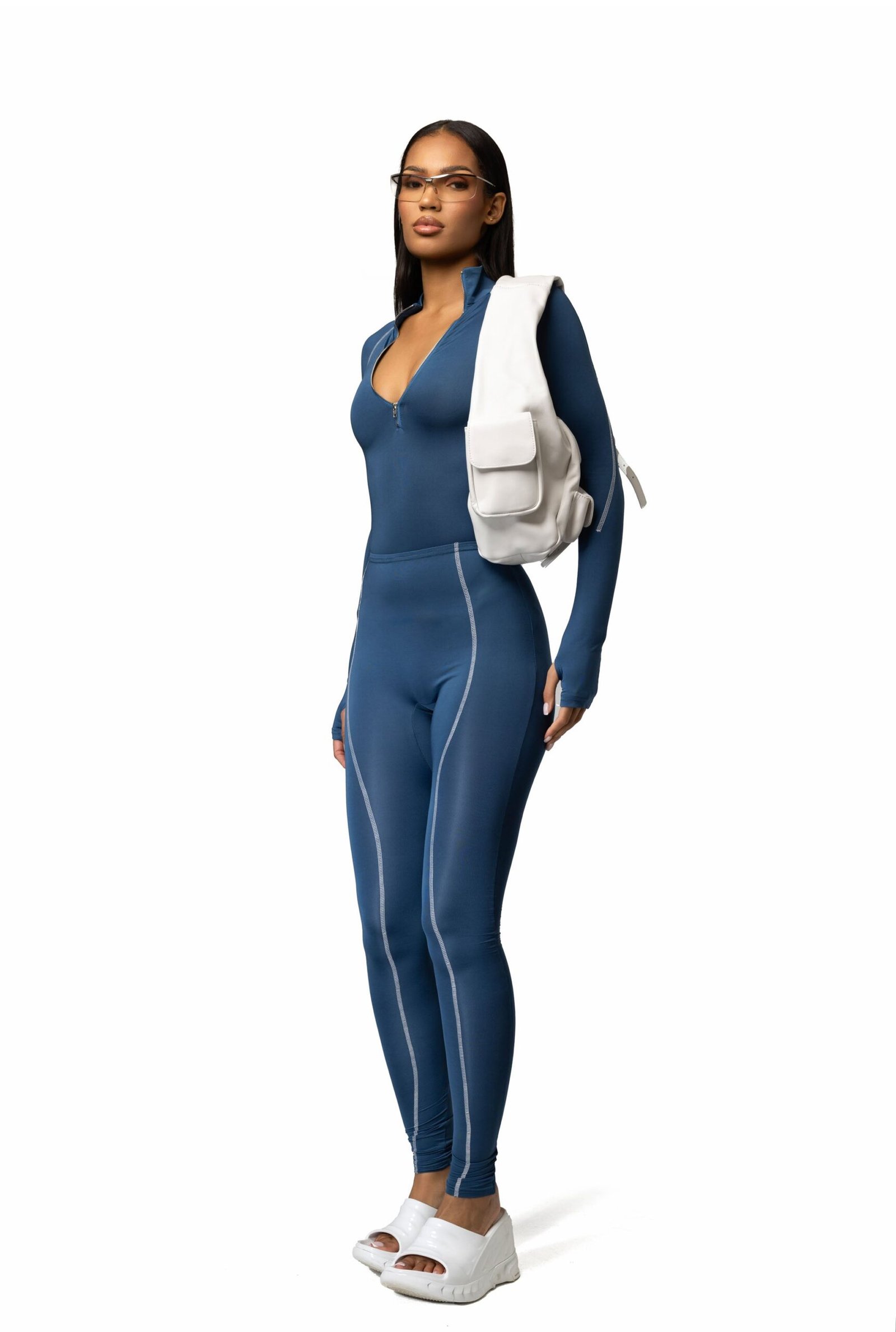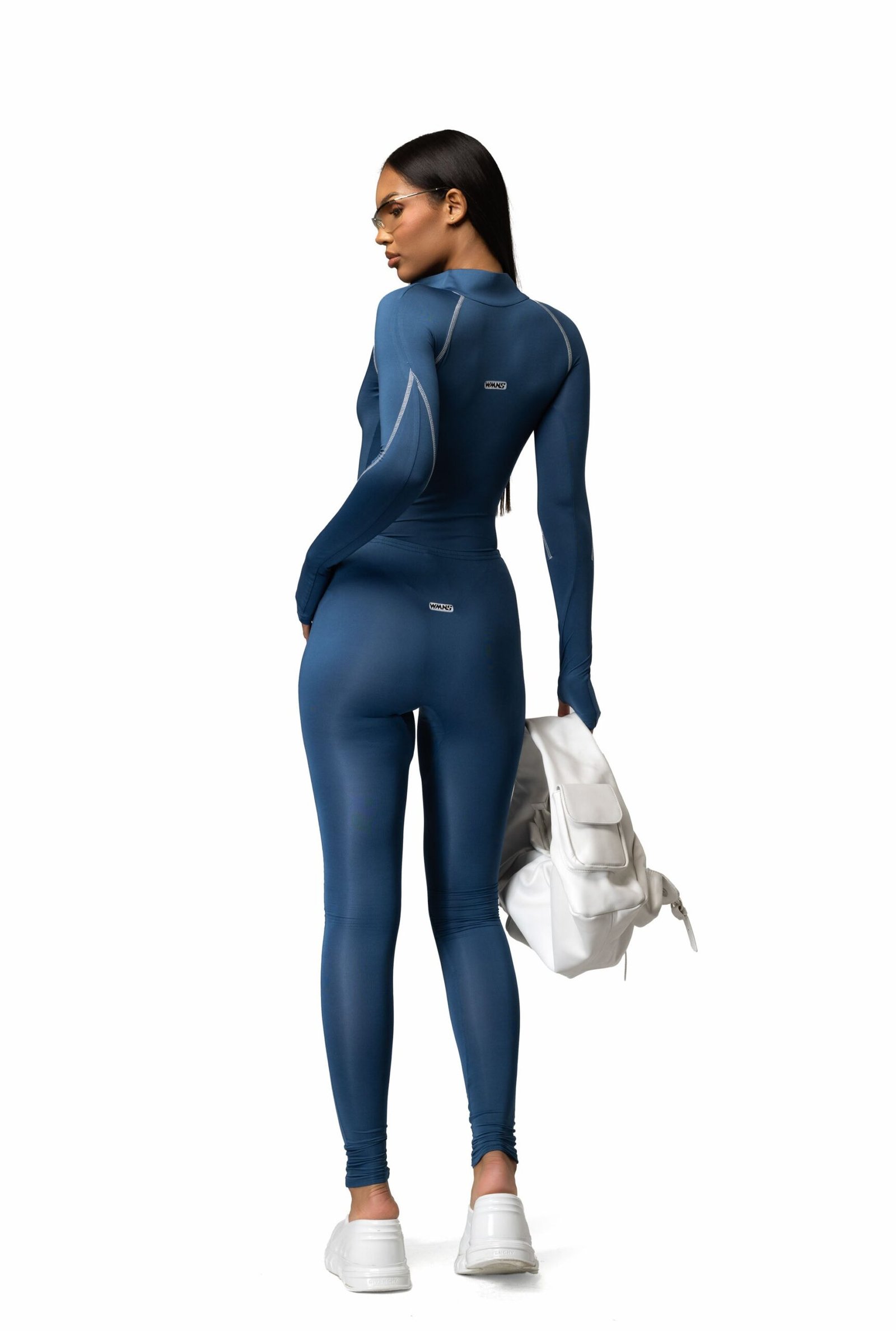 Rich blue high waisted leggings with extra long leg and high neck long sleeve zip back bodysuit with thumb hole feature co-ord.  The Top is reversible and can be worn on the zip side.