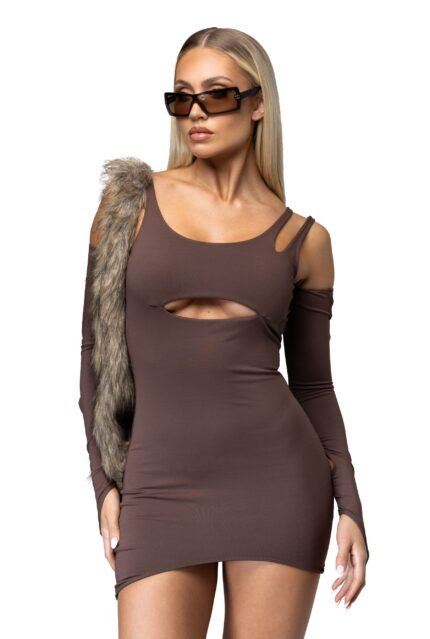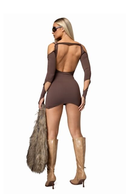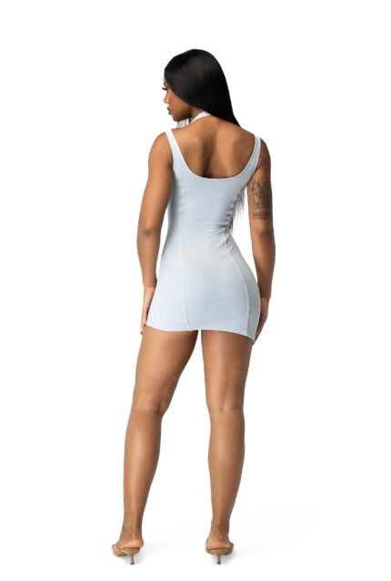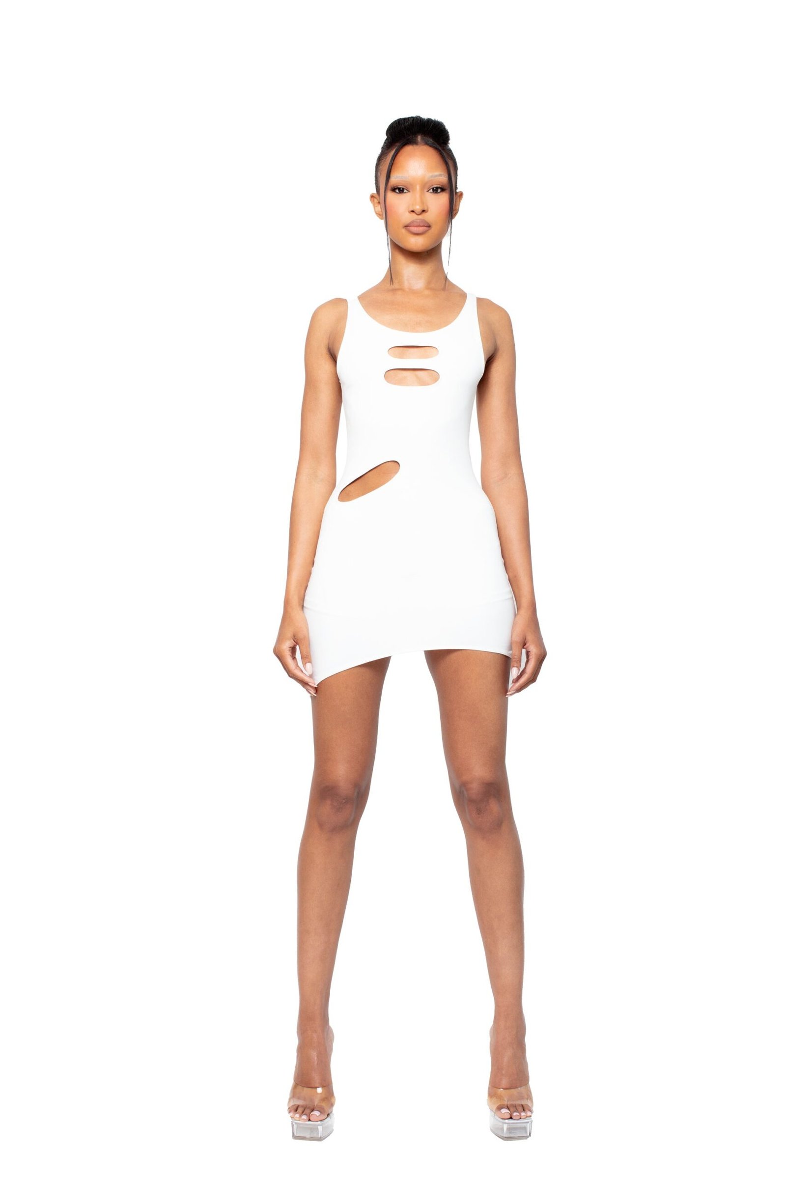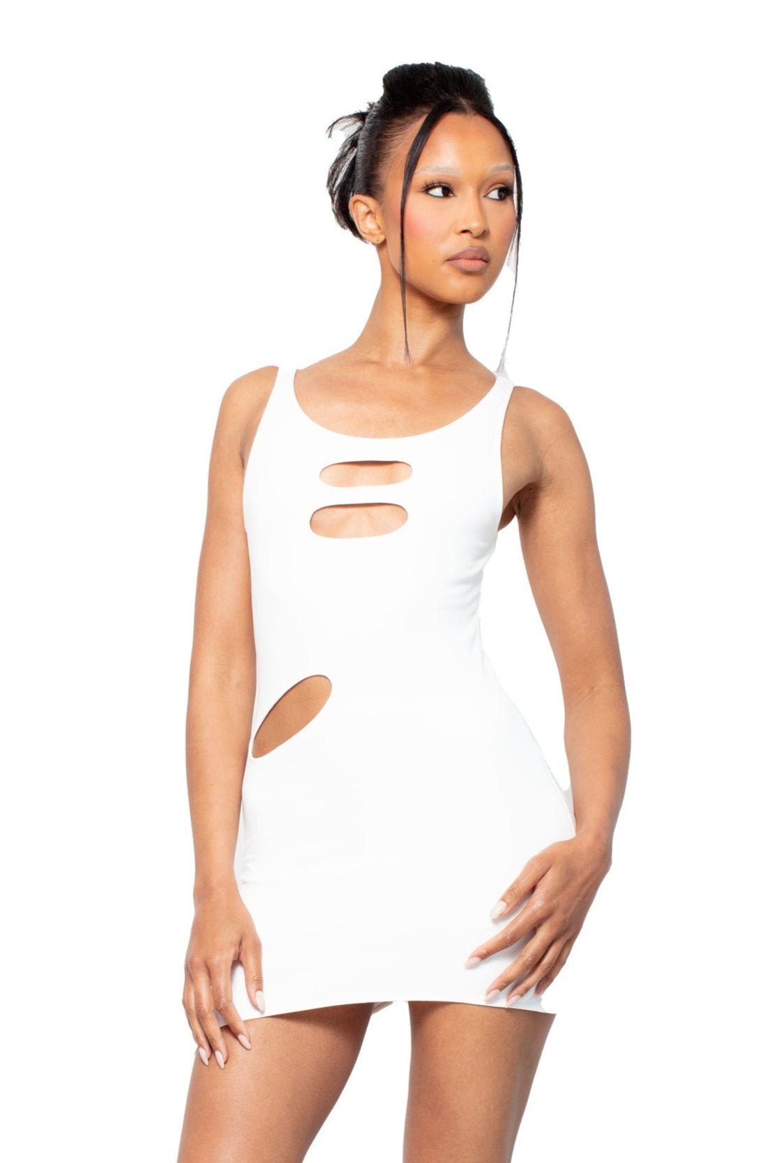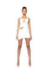 This Y2K-inspired white mini dress reimagines nostalgia with a built-in skort, bust and hip cut-outs, and strappy detailing. Featuring a curved scoop neckline and asymmetrical hemline, it’s a playful yet sleek statement piece.