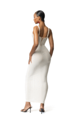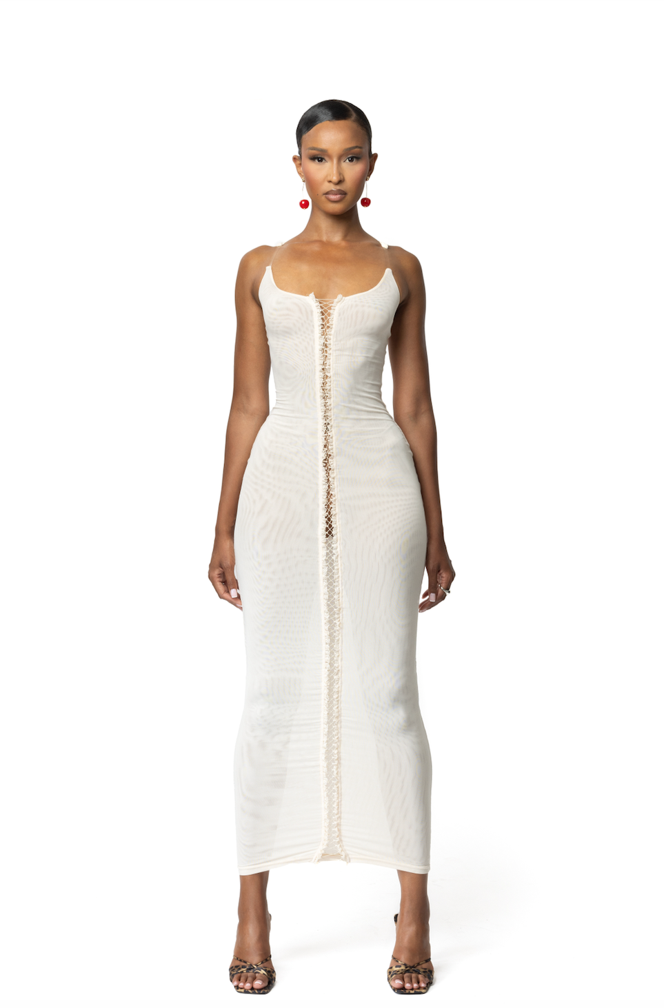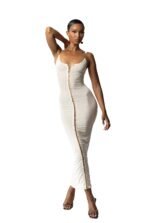 The Buttr mesh milk midaxi dress features a double-layered mesh design, lace-up front, and milky white hue. With a flattering silhouette, invisible straps, and a subtle V-neckline, it’s a dreamy choice for any occasion.