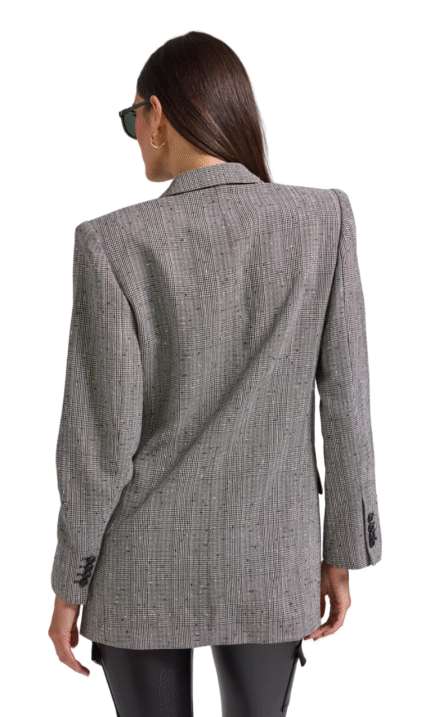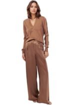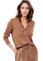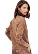 The “Camden Sweater” in Nutshell from Cami NYC is a long sleeve V-neck sweater that features a sheer lace back and ribbed detailing at the neckline, sleeve openings, and front hem. True to size.