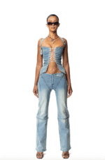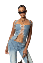 Elevate your wardrobe with our Lace-Up Front Denim Corset, blending vintage charm and modern style. Featuring a lace-up front, split-point hem, and waist-cinching fit, it’s perfect for pairing with Khim pants or your favourite bottoms.