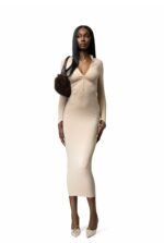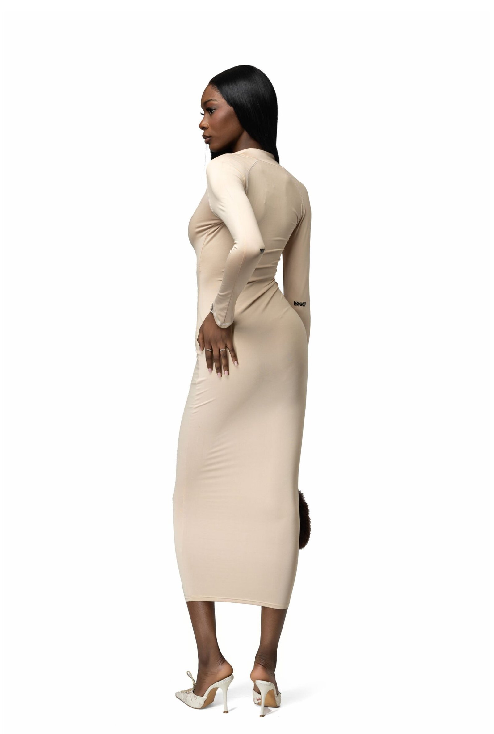 Zip front nude bodycon midaxi dress, including long sleeves and pointed cut sleeve.