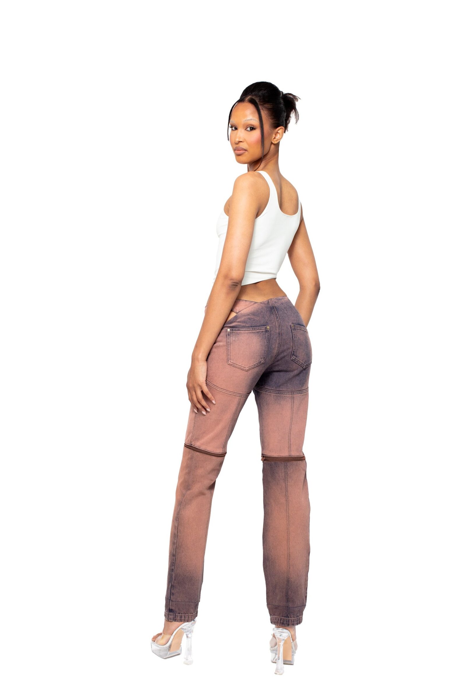 Versatile low-rise trousers with a knee unzip for full-length or capri style, featuring edgy panelling, a cutout waist, and back pockets.
