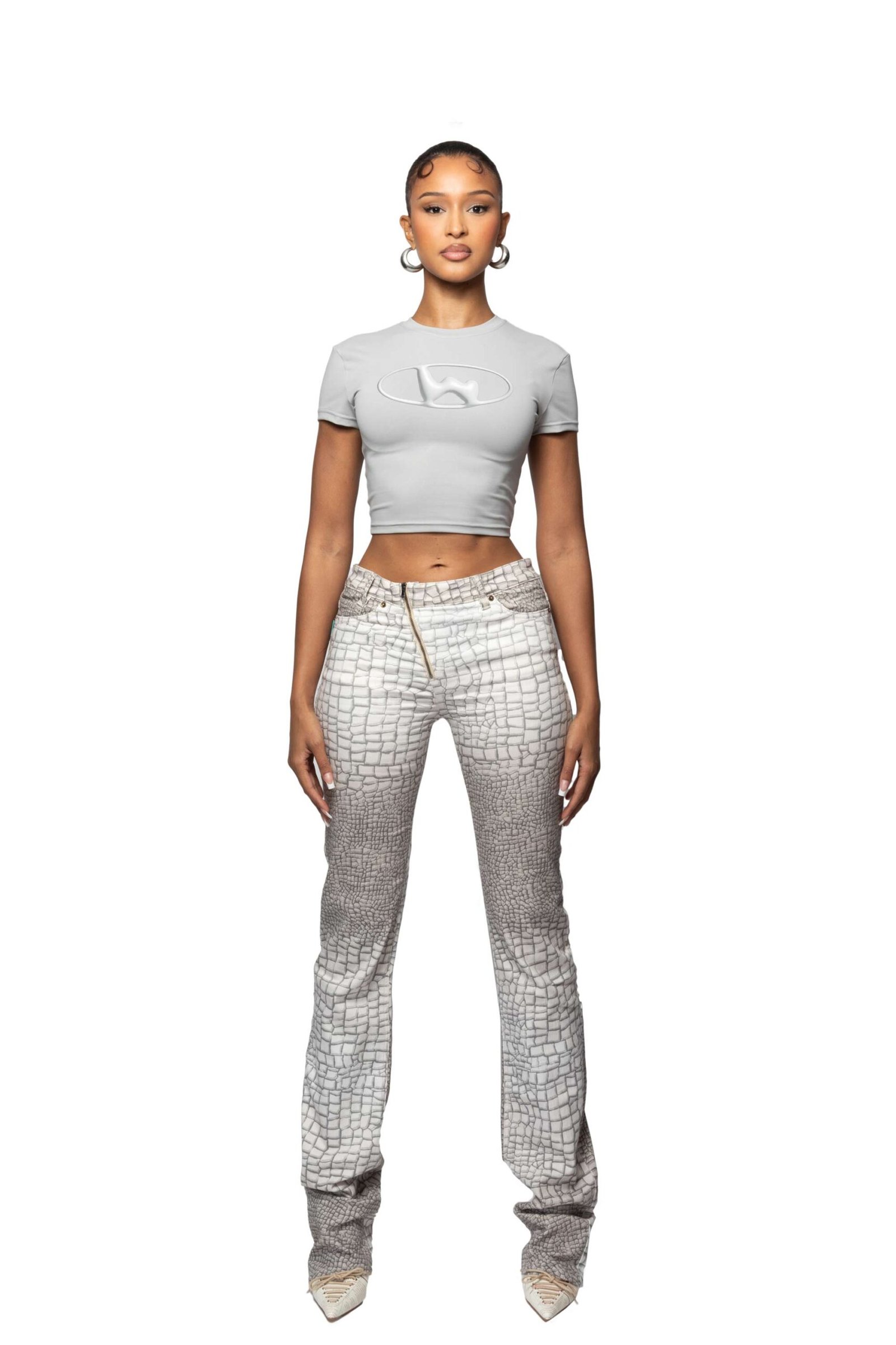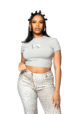 Elevate your wardrobe with this cropped grey baby tee featuring a chrome silver W motif. Soft, breathable, and form-fitting, it pairs effortlessly with jeans, skirts, or athleisure.