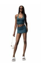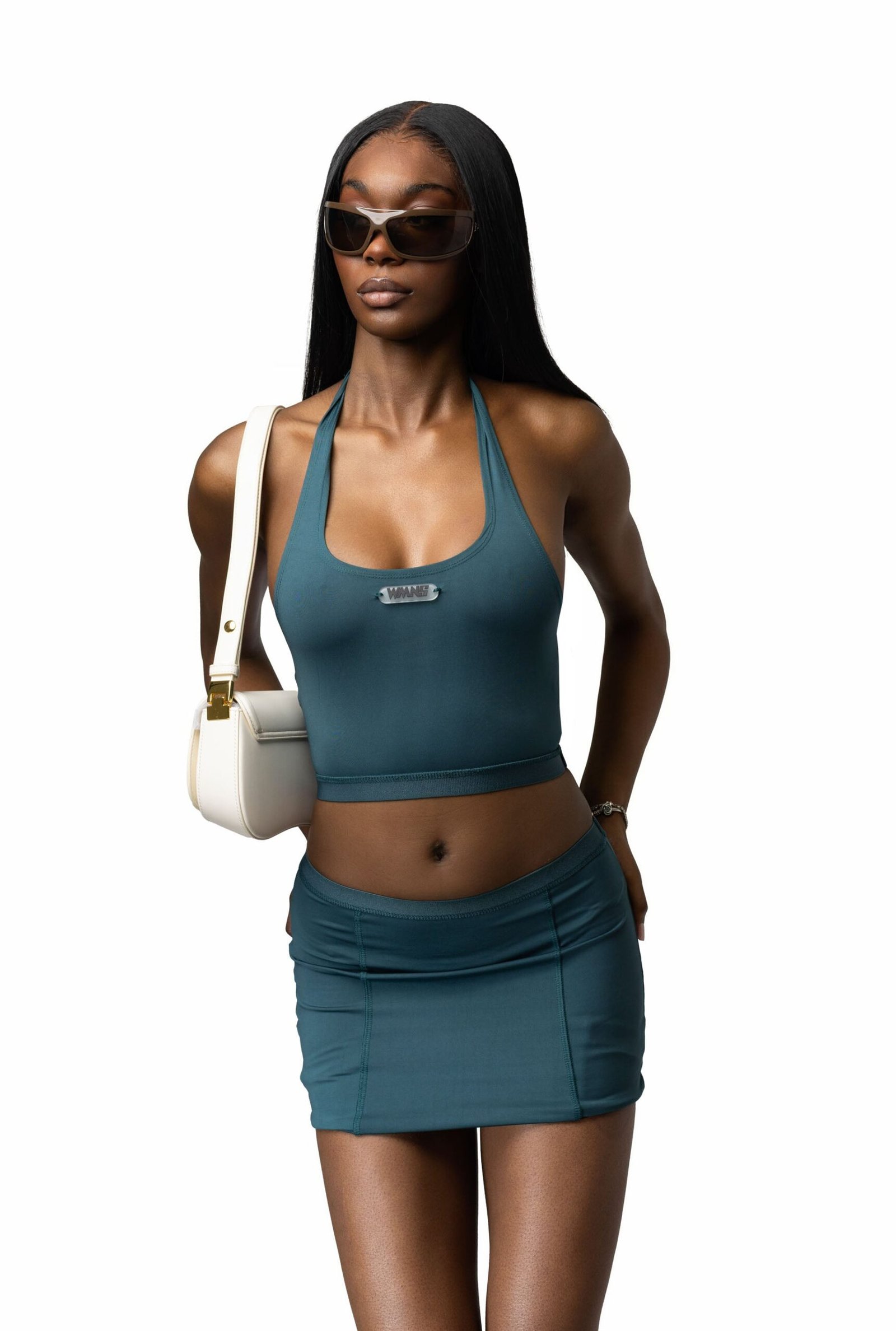 Stretchy ribbed two piece skirt and crop top set. Teal high waisted mini skirt with elasticated waist band and front panel line detailing. Matching halter neck crop top. 3D rubber logo feature on skirt and top.