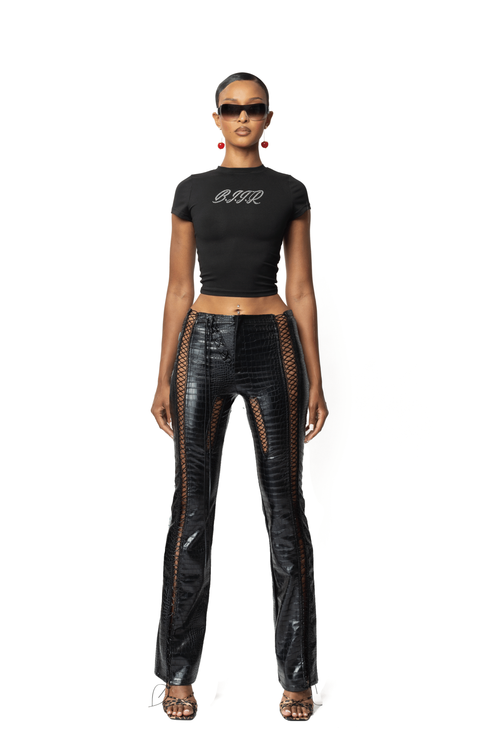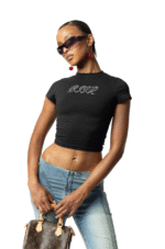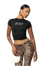 The KITTY Baby Tee, inspired by Y2K, features a rhinestone motif, cropped fit, and soft cotton-elastane blend. Perfect with RAWR capris, jeans or skirts.