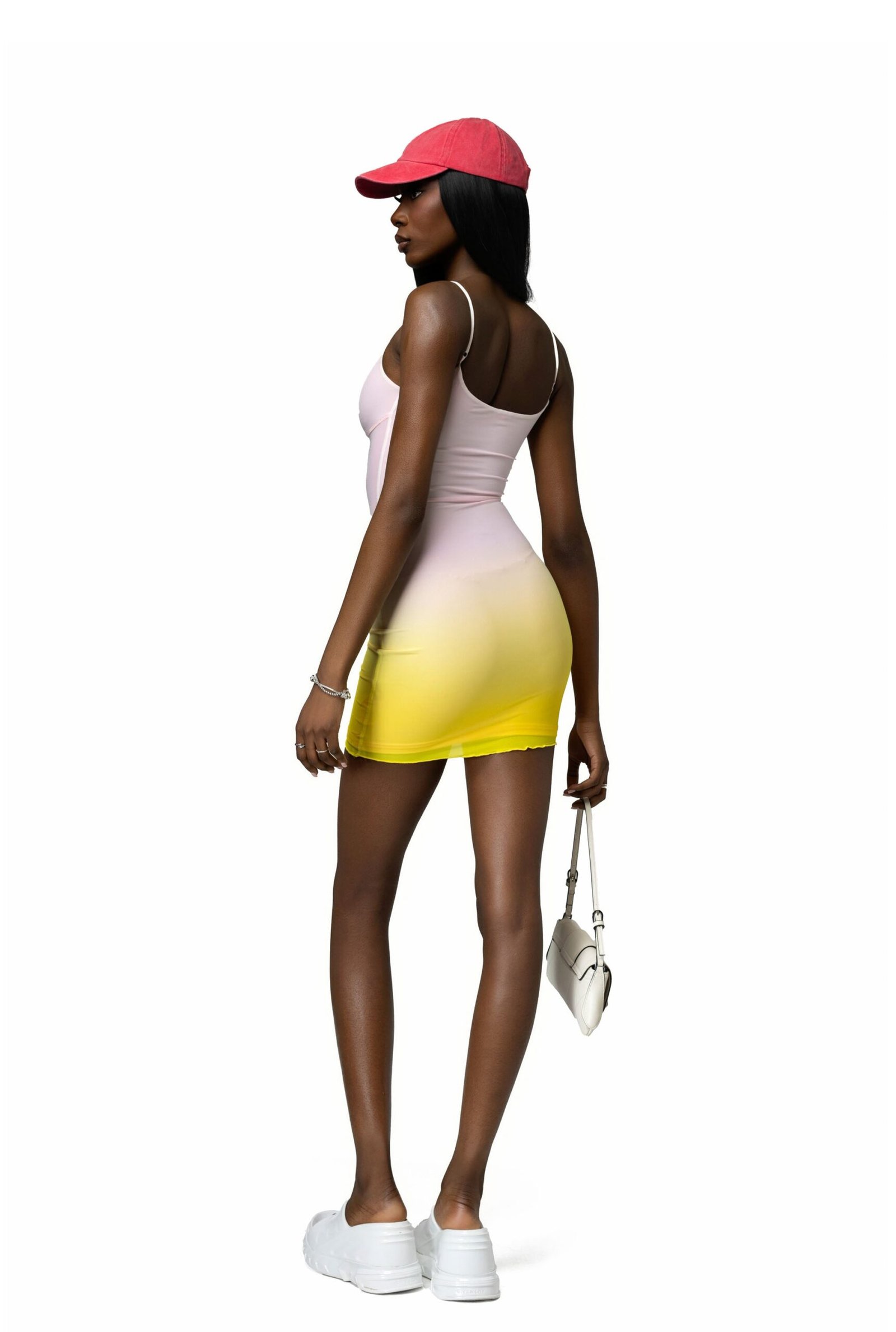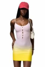Pink ombré Lemon mesh overlay mini dress with wide set adjustable thin straps. Fully lined. Cut out centre feature and soft bust outline detailing.