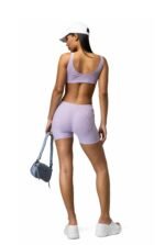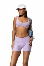 Lilac ribbed cycling shorts and scoop neck sleeveless crop top co-ord. Biker style panel detailing on front and back of shorts.