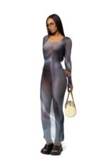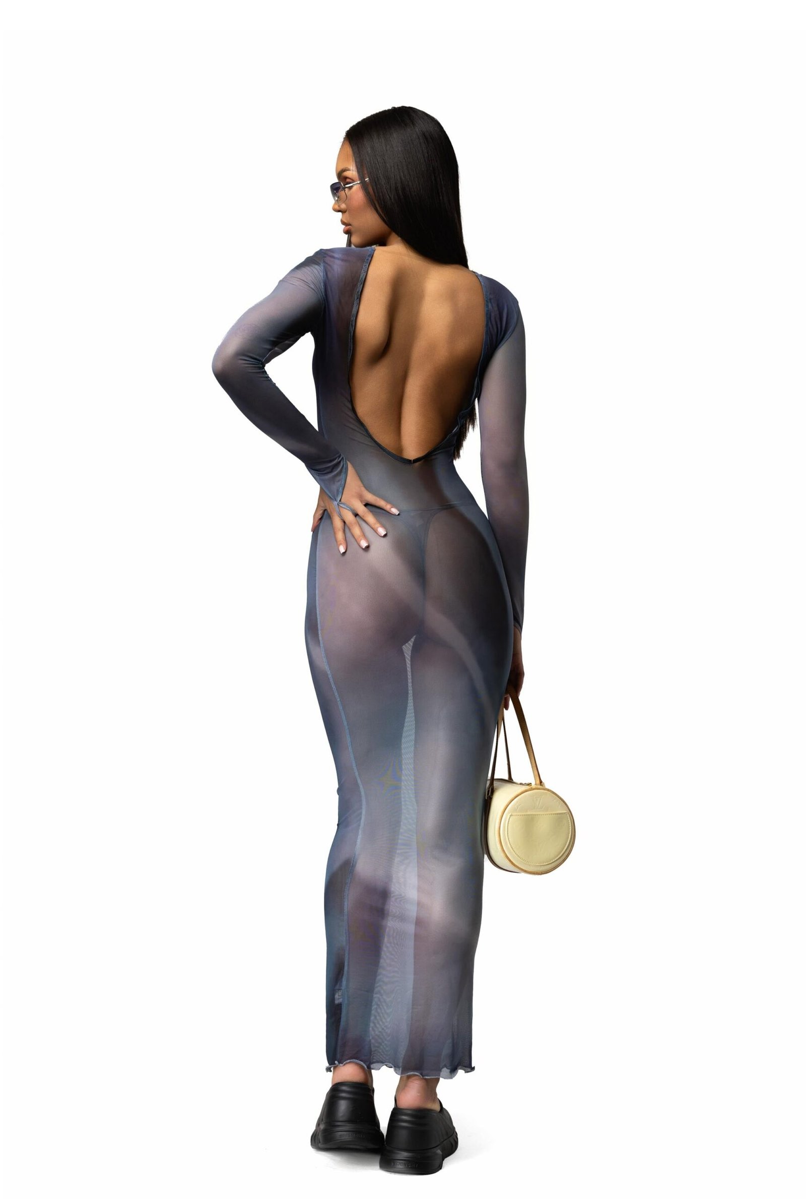Iridescent grey full mesh maxi dress with scoop back and curved neckline. Long sleeve finger hole feature. Underwear not included with garment.