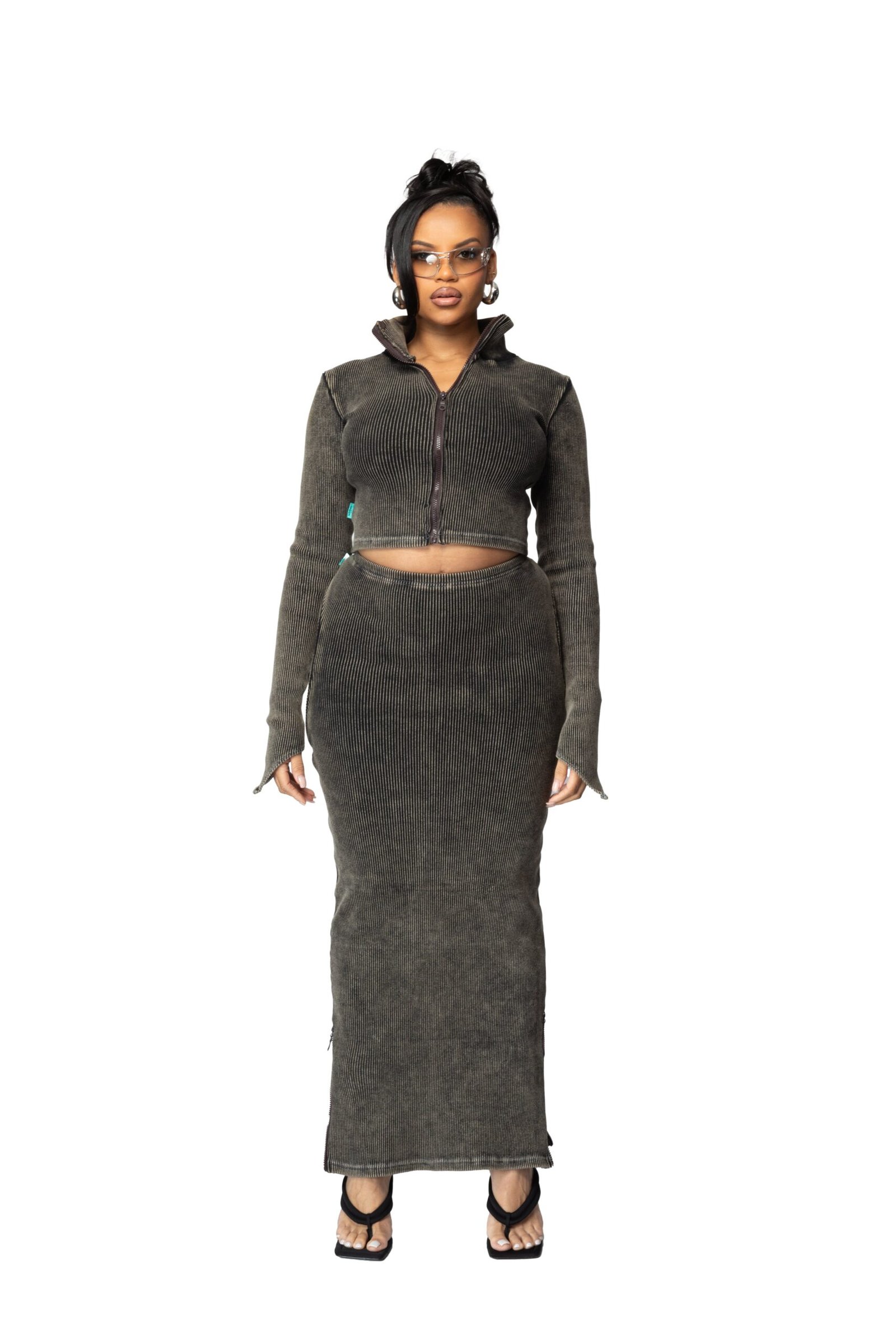 This ribbed midaxi skirt with an elastic waistband and three zips offers comfort, style, and a contouring fit. Pair with the STOP tank or PLAY jacket.