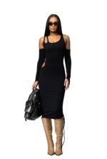 Hooded midaxi dress with cut-outs, detachable sleeves, and tie-side ruching for an asymmetric hem. Features cold shoulders, crescent hip cut-out, and finger hole cuffs.Available in black and nude colour.