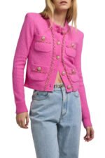 The “Selma Chain Cardigan” from Generation Love is a vibrant addition to your outerwear collection. This unlined cardigan features a comfortable regular fit, making it perfect for layering. Its charming pink hue is complemented by four functional patch pockets, providing both style and practicality. Gold shank buttons add a touch of elegance, elevating this piece for any occasion. Effortlessly chic, this cardigan is ideal for dressing up casual outfits or adding a pop of color to your ensemble.