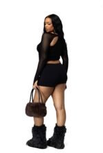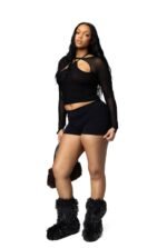 Layered long sleeve crop top in supportive power mesh, featuring a halter neck, racerback, finger holes, and bold cut-outs with crescent detail.