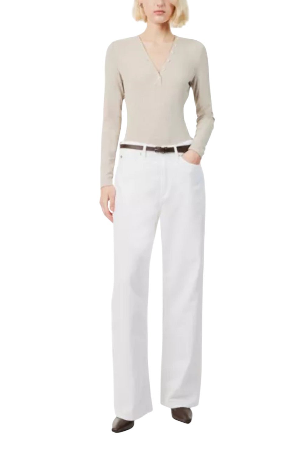 The “Slinky Long Sleeve Henley” from Frame is a ribbed, long-sleeved top with asymmetrical button detailing at the deep V-neck and a subtle center stitch at the back. Made from stretch modal, it offers an ultra-soft, pliable fit that effortlessly smooths and tucks into your favourite jeans.