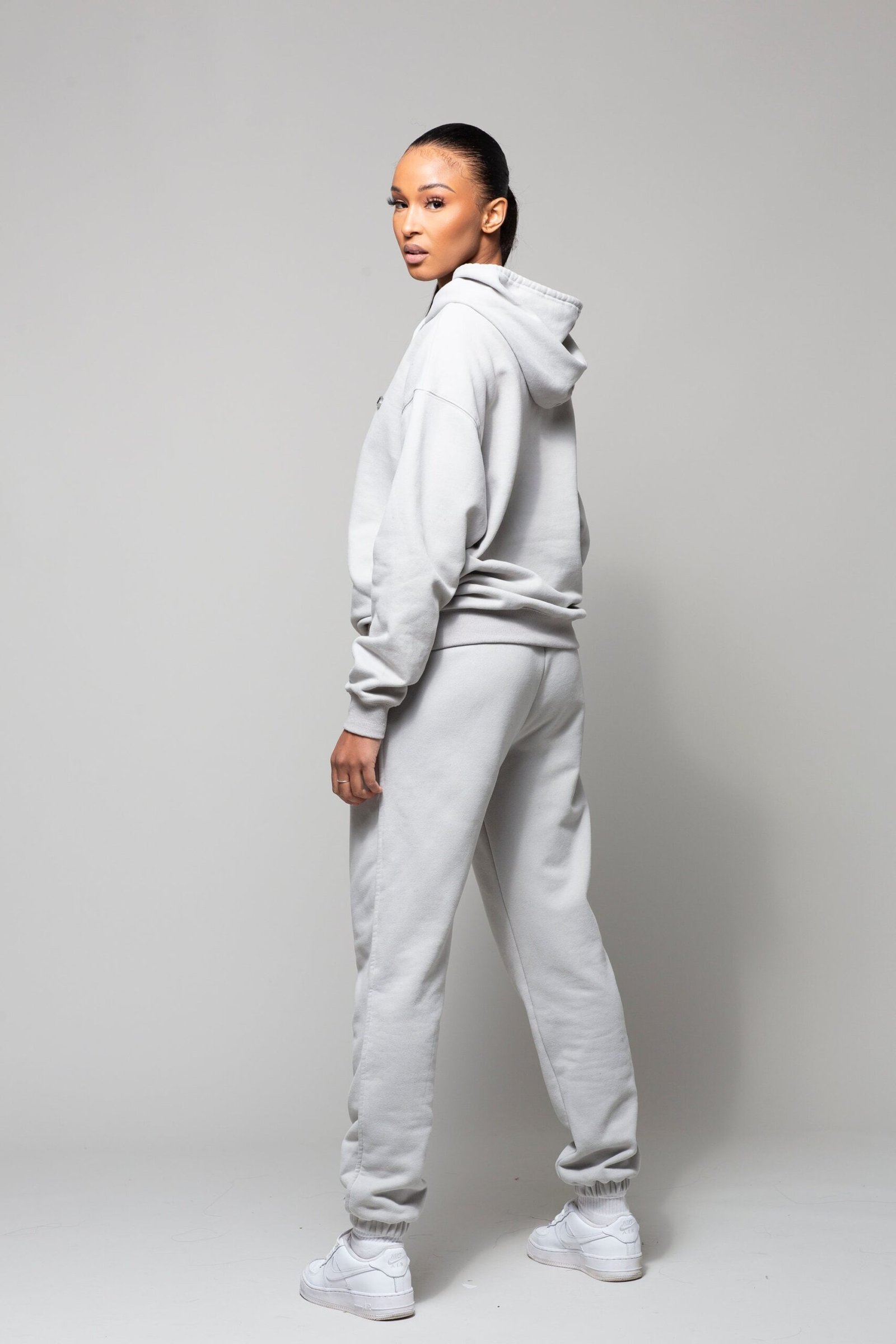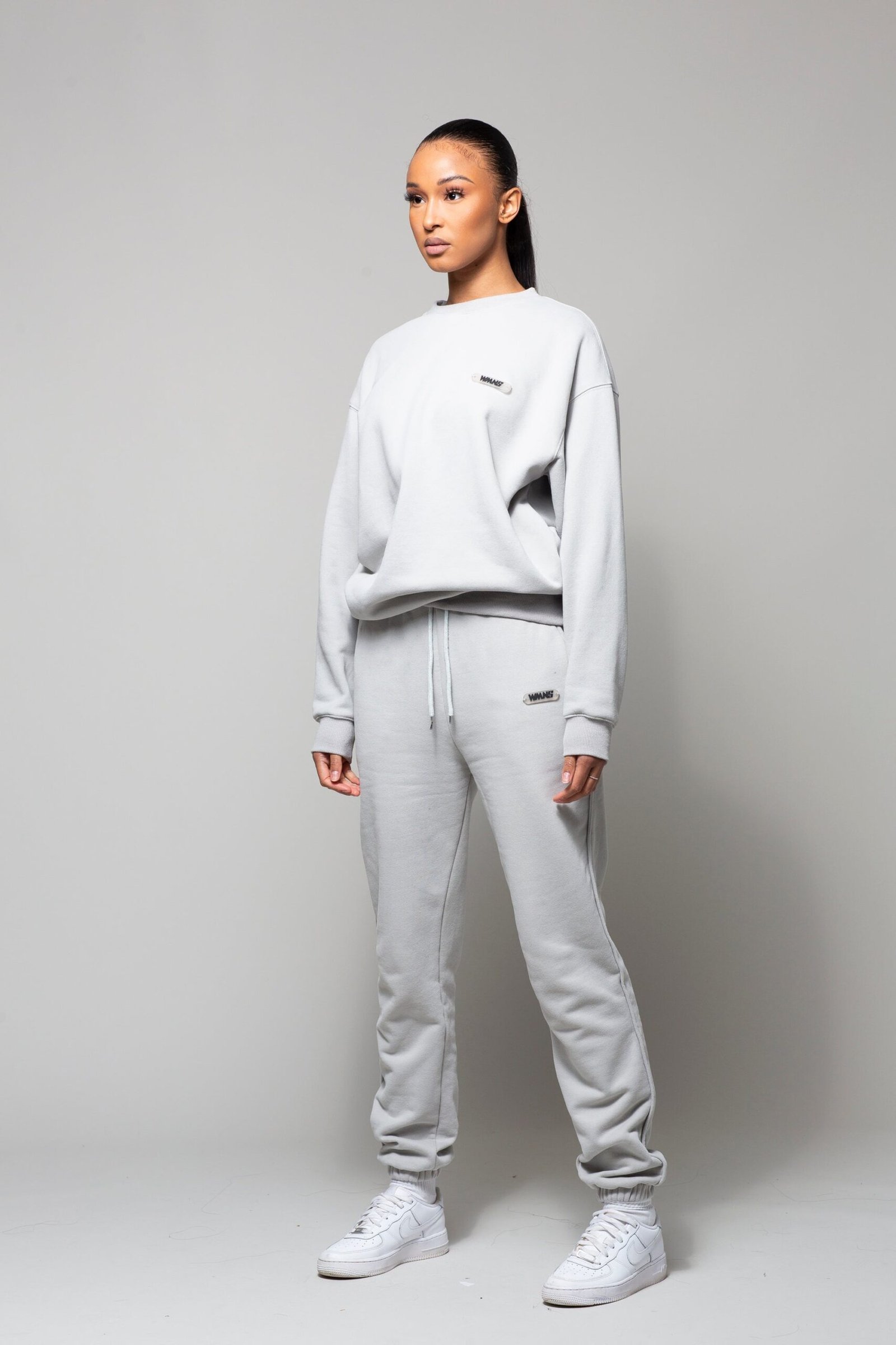 Grey classic full length joggers. Custom 3D rubber ‘WMNS’ logo embroidery feature on left hand thigh. Relaxed fit. Two side pockets. Flattering pull cord elasticated waist band. Gathered ribbed cuffs.