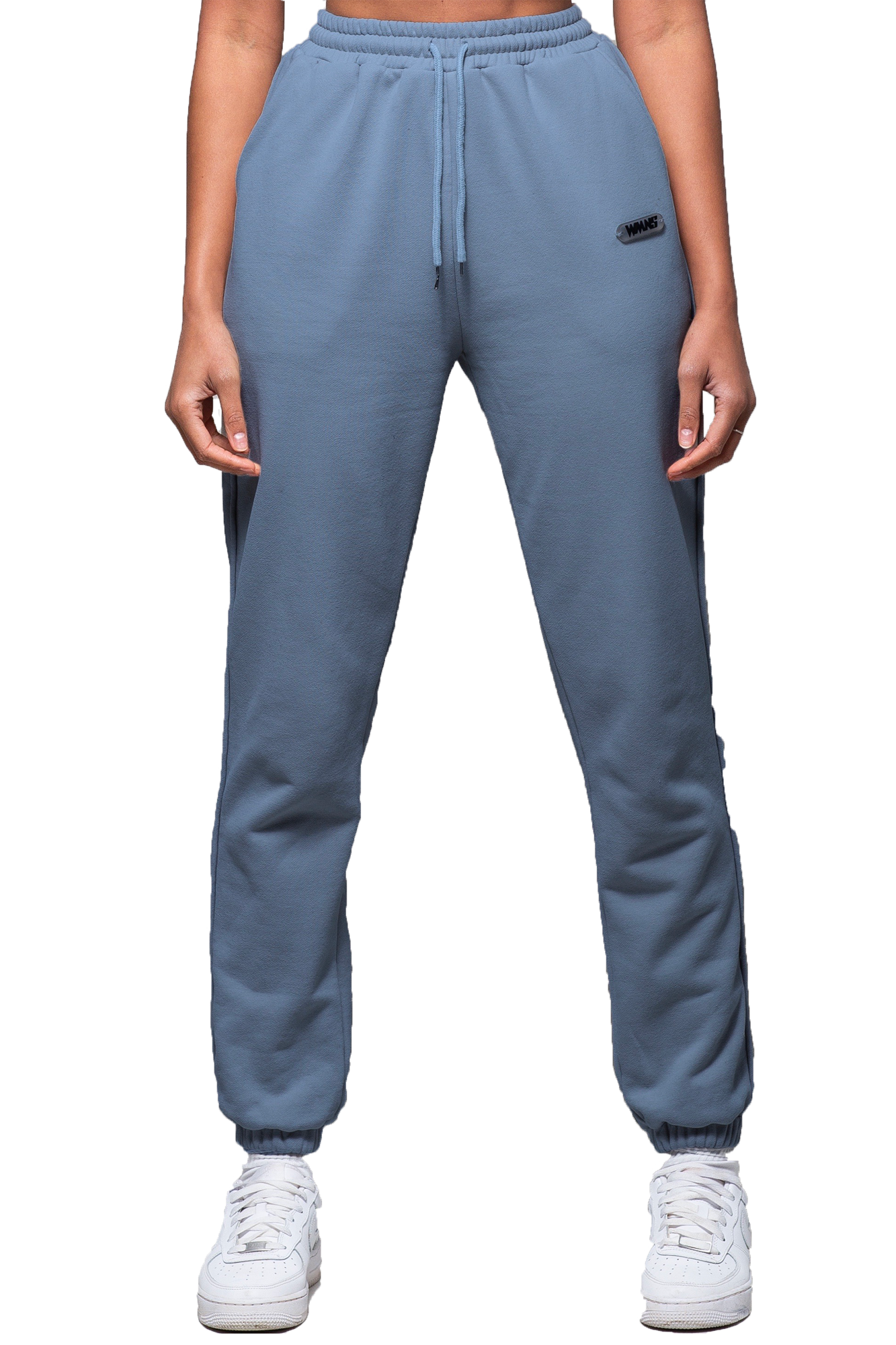 Stone blue classic full length joggers. Custom 3D rubber ‘WMNS’ logo embroidery feature on left hand thigh. Relaxed fit. Two side pockets. Flattering pull cord elasticated waist band. Gathered ribbed cuffs.